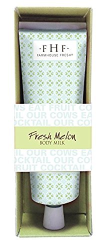 This silky lotion from FarmHouse Fresh is as cool and juicy as a slice of fresh melon! A simply irresistible green melon and natural cucumber extract blend has a refreshing, good morning scent that makes you happy from the moment it hits your skin. Just like our original body milk lotion, Sweet Cream, this product pours over you like milk and comes packaged in our adorable cow box with the statement "Our Cows Eat Fruit Cocktail." 2.4 oz aluminum tube with decorative box. 90.5% natural, and like all FarmHouse Fresh Products, Fresh Melon is Paraben & Sulfate free. Made in Texas!Feature