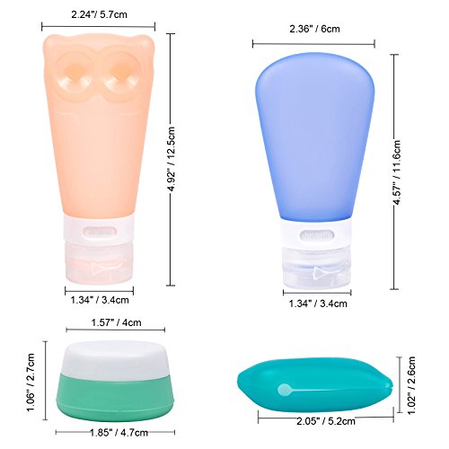 - 2 x 2.8oz owl bottles with suction pads, 2 x 2oz bottles (no suction feature), 2 x 20ml jars and 2 toothbrush covers, TSA Airline Carry-on Approved. Capacity on Each Bottle for easy and convenient security check. (Little Jars don't have capacity on them)