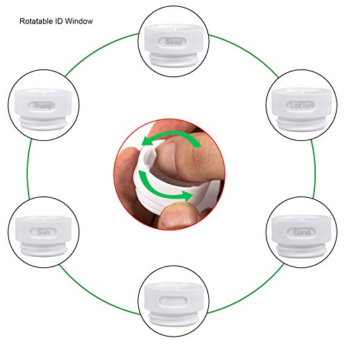 - Rotatable ID Window, each travel bottle has pre-printed labels (Shamp./ Soap/ Lotion/ Cond./ Sun/ Blank), you can set the label at your demand to help you identify the content. Different colors also can help to identify the bottle.