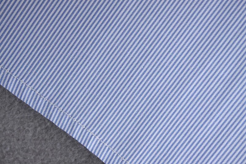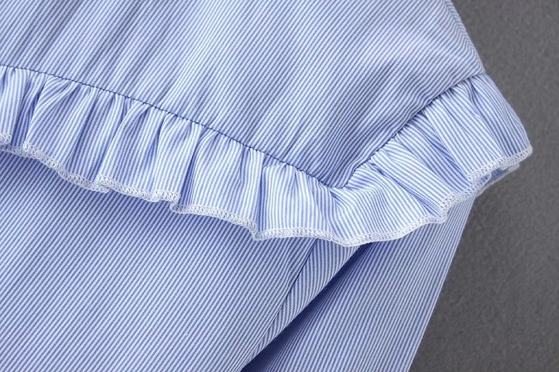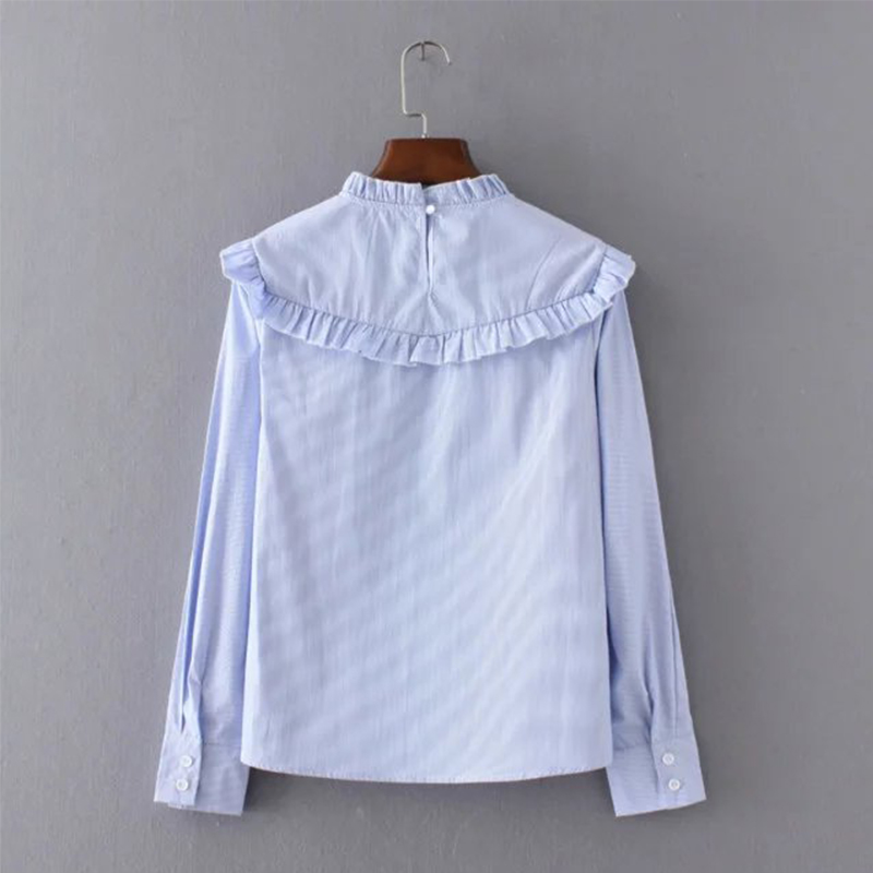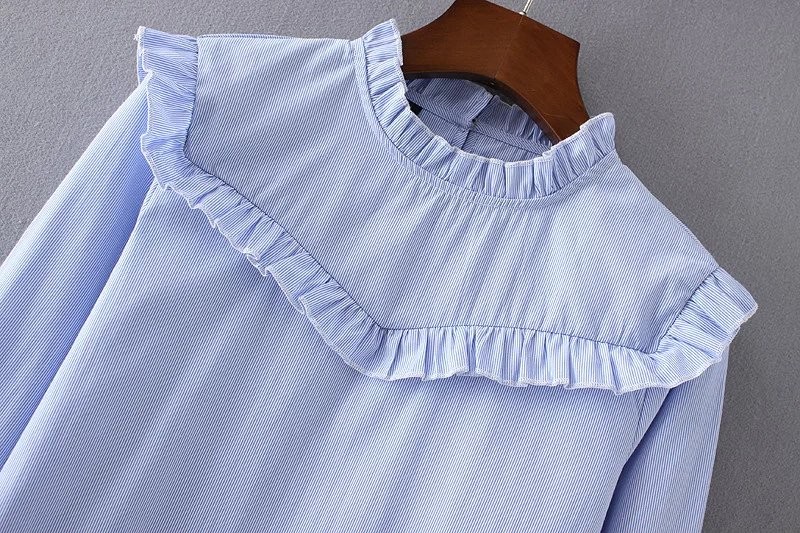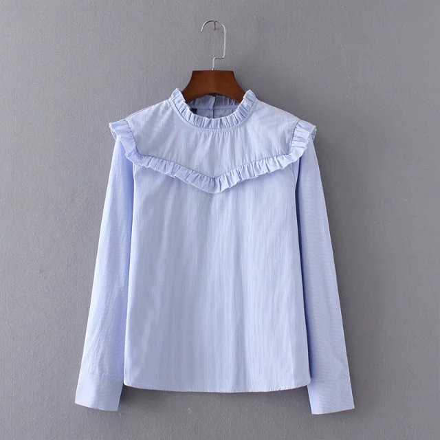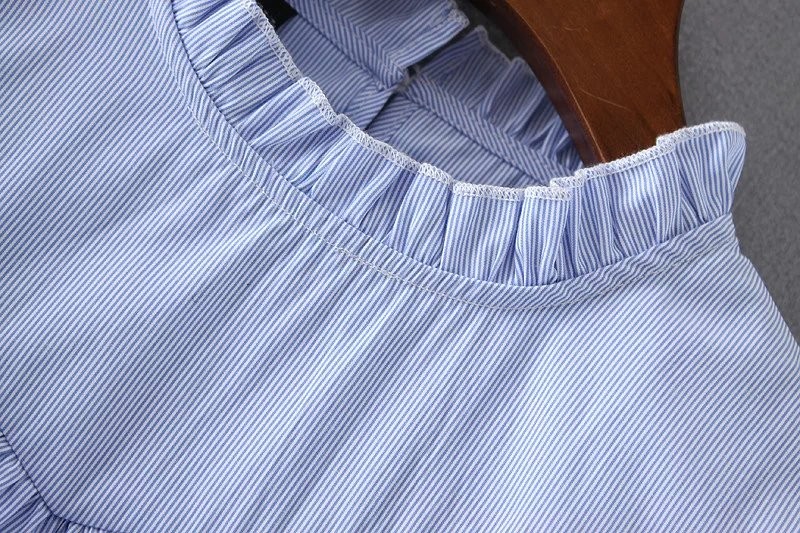 Elegant Blue Women Shirts Fashion Ruffle Ruched Pinstripe Woman blouses Stand Collar Long Sleeve Tops