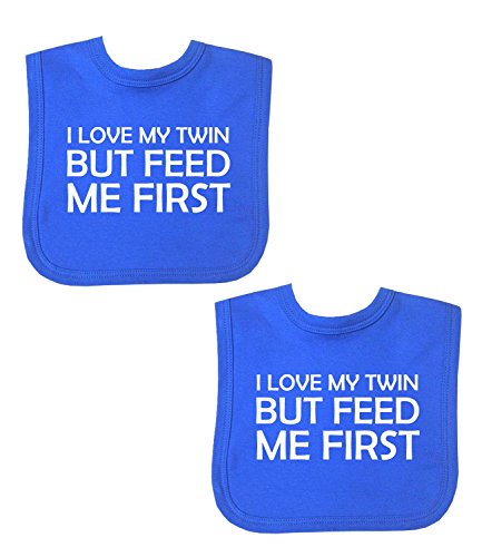 -. Feature : BabyPrem pack of 2 soft cotton velcro bibs / P.R.Inted on the front with 'I LOVE MY TWIN BUT FEED ME FIRST' / One size from newborn upto 6 months / Shipped from the Uk, please allow aprox. 10 days for delivery / Despatched same day if order rec'd before 12pm Mon - Fri (exc Bank Holidays)