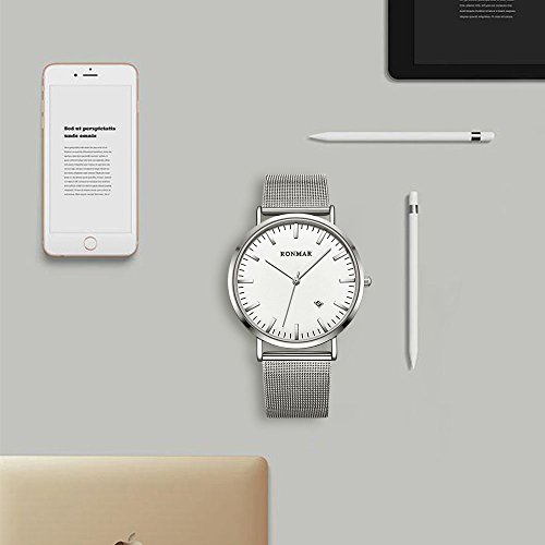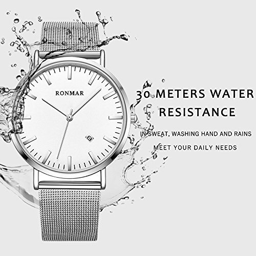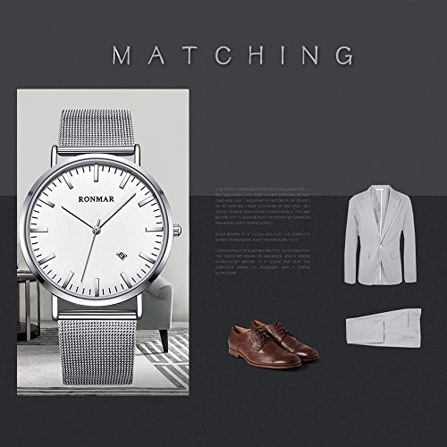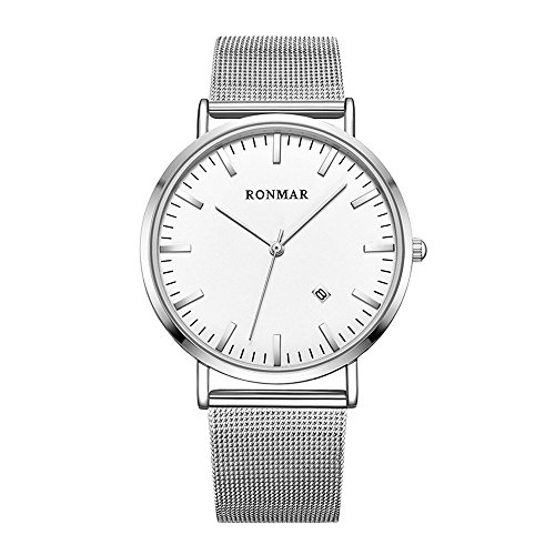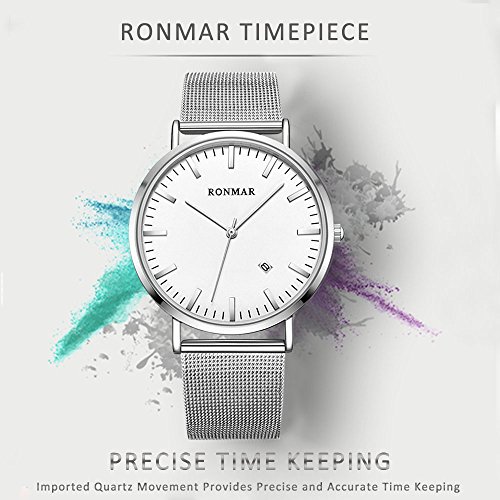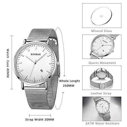 Brand, Seller, or Collection Name:Ronmar Part Number:Ronmar Item Shape:Round Display Type:Analog Case diameter:40 millimeters Band Material:mesh Band length:Men's Standard Band width:0.79 inches Band Color:Silver Dial color:Silver Special features:Backup battery Movement:Quartz