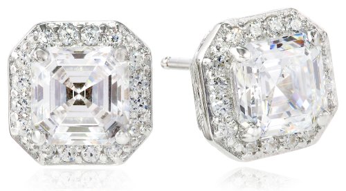 - Feature : Platinum-plated earring featuring asscher-cut Swarovski zirconia centerpiece framed in halo of smaller stones^Cubic Zirconia is an affordable diamond alternative that reveals brilliant shine and a meticulous cut.^Imported