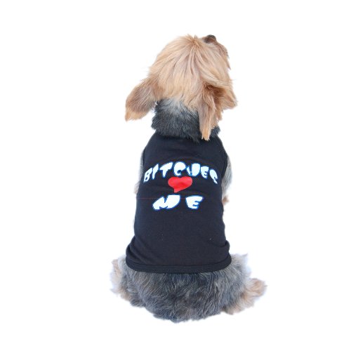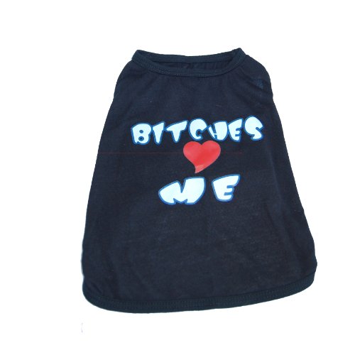-. Feature : Black cotton tee shirt / Bitches Love Me printed on back / Machine washable / For breed sizes like Chihuahua / Miniature Doberman / puppies