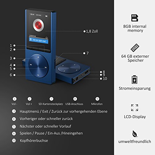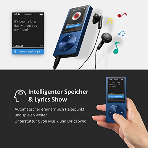 Intelligente Speicherfunktion: Die MP3-Player werden die letzte Spielzeit vor dem Herunterfahren automatisch speichern und weiter nach dem Neustart spielen. Der Musik Player hat einen internen Speicher von 8GB und erweitert 64 GB Mikro-Sd Karte, Bietet genug Platz fur all Ihre Lieblingsmusik.