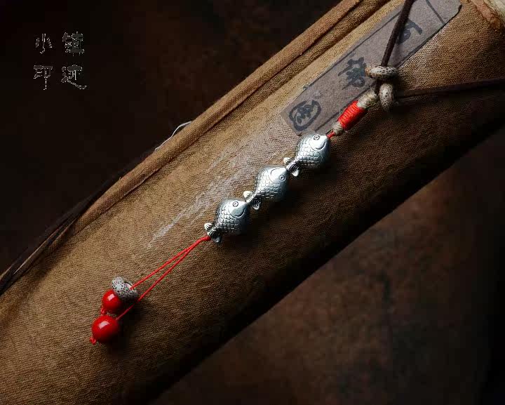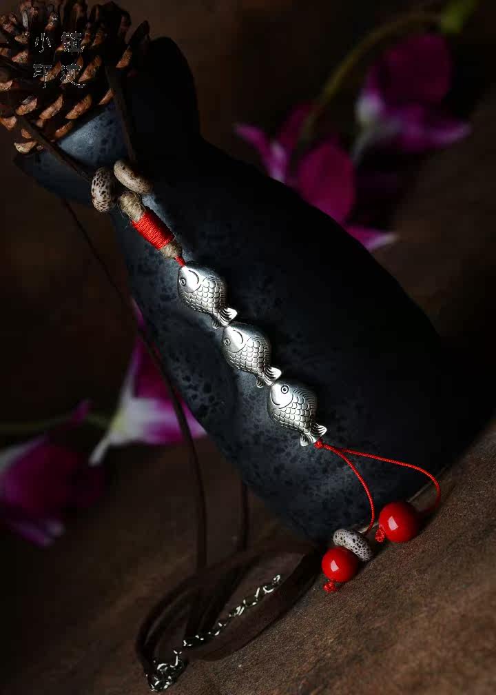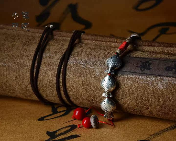 Material: leather caress, Tibetan silver fish, twine, ceramics, glass