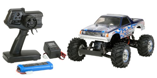 スタイリッシュなトラックボディにビッグタイヤを組み合わせ、後輪2輪駆動シャーシで迫力ある走りが楽しめる完成電動ラジオコントロールカーです。シャーシは強度の高いポリカーボネート製モノコックフレームを採用。重量バランスに優れ、4輪ダブルウィッシュボーンサスペンションを装備。カスタムムードあふれるメッキホイールに、直径130mmのラグパターンピンスパイクタイヤを装着して、荒れた路面をダイナミックに走破します。ボディは軽量でショックに強いポリカーボネート製、ビッグタイヤマシンにふさわしい派手なマーキングもポイントです。RCメカはクリスタル交換など、バンド調整の必要がなく、気軽に複数台で走行が楽しめる2.4GHzを採用。前後進ともスムーズなスピード調整が可能なESC(エレクトロニック・スピード・コントローラー)を搭載しました。(ITEM 57839)★全長445mm、全幅310mm、全高238mm 動力用7.2Vバッテリー、充電器、ホイールトリガータイプの2チャンネル送信機付き ※送信機用電源(単3形電池4本)は別売りです。Feature