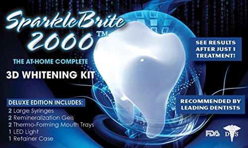-. Binding : Misc. -. Brand : SparkleBrite(TM) -. EAN : 0606345400699 -. Feature : PROFFESIONAL FORMULA - SparkleBrite's Professional formula is DDS tested and approved - that means it is 100% safe and you can feel 100% comfortable using! / EASY & SIMPLE - our kit is easy and simple to use - you will begin seeing results after just one use and years of stains will be removed after a couple of uses! / WHITER AND BRIGHTER - Begin showing off your shiny white smile! White teeth are proven to boost ones self image! Freel beautiful after completing this premium grade teeth whitening kit and removing yeard worth of stains! / ENAMEL SAFE AND SENSITIVE - safe for those with sensitive gums yet effectively whitens your teeth and removes stains leaving you with a PEARLY WHITE SMILE! / 100% MONEY-BACK GUARANTEE: The results will speak for themselves! -. IsAdultProduct : 0 -. Label : SparkleBrite(TM) -. Manufacturer : SparkleBrite(TM) -. MPN : 606345400699 -. PartNumber : 606345400699 -. ProductGroup : Beauty -. ProductTypeName : BEAUTY -. Publisher : SparkleBrite(TM) -. Studio : SparkleBrite(TM) -. Title : SparkleBrite - Professional At Home 3D Teeth Whitening Kit - With LED Accelerator Light! -. UPC : 606345400699