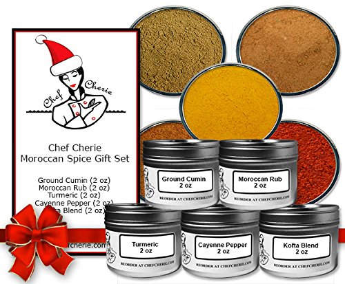 -. Binding : Misc. -. Brand : Chef Cherie -. Feature : All natural. Never any MSG or fillers. Our spices are 100% pure. / Set contains: Ground Cumin, Moroccan Rub, Turmeric, Cayenne Pepper and Kofta Blend. / Our manufacturer custom packs all orders by hand so you know your spice is fresh. / A perfect gift for any home cook or aspiring chef. / Comes in convenient 2 oz. tins for easy use and storage. -. IsAdultProduct : 0 -. Label : Spicehouse USA -. Manufacturer : Spicehouse USA -. PackageQuantity : 1 -. ProductGroup : Grocery -. ProductTypeName : GROCERY -. Publisher : Spicehouse USA -. Studio : Spicehouse USA -. Title : Chef Cherie's Moroccan Spice Gift Set #1 - Contains 5 2 oz. Tins