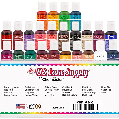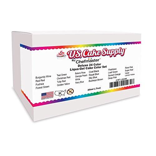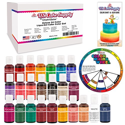 24 Color Liqua-Gel Set Primary & Secondary Includes: Coal Black, Royal Blue, Sky Blue, Buckeye Brown, Fleshtone, Leaf Green, Sunset Orange, Deep Pink, Rose Pink, Super Red, Violet, Lemon Yellow, Burgundy Wine, Fuchsia, Forest Green, Christmas Red, Tulip Red, Golden Yellow, Bakers Rose, Georgia Peach, Red Red, Teal Green, White, Navy Blue
