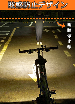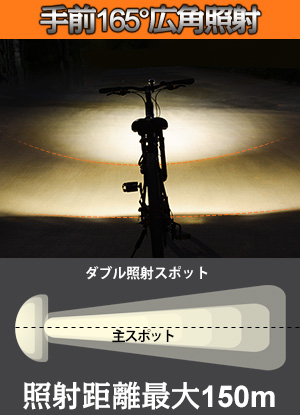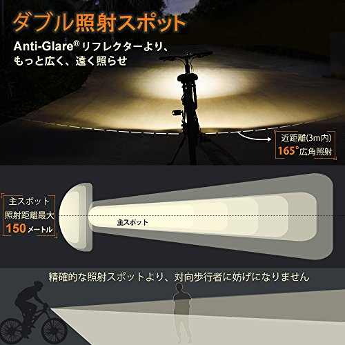 本品はドイツAnti-Glareリフレクターを搭載、特殊な構造によって、一般的な自転車ライトと違い2重ビームスポットを備えています。手前1~3メートルでは165°の広い面を照らせる一方、主スポットは最大150メートルまで照らせます。Uターンの時、左右の地面状況をはっきり把握でき、更にサイドからの視認性を高めています。