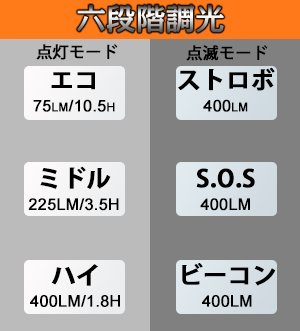 ルミントップC01では3段階調光でき、高速走行中はハイモードで長い距離をてらせる、夜灯のない街ではミドルもーどでいけます。市内で利用する時には、エコモードで点灯し、MAX10.5時間まで使用いただけます。点滅モードは任意点灯モードで、スイッチを約4秒間押し続けてオンになれ、緊急時に役に立っております(詳しくは説明書にご覧いただけます)。