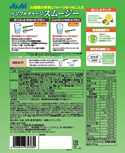 原材料: 水溶性食物繊維、コラーゲンペプチド、野菜・果実混合汁(人参、リンゴ、オレンジ、その他)、砂糖、ホエイパウダー(乳製品)、野菜混合粉末、バナナ粉末、グレープフルーツ果汁パウダー、キウイフルーツ果汁パウダー、トマトペースト、植物発酵エキス末、乳酸菌粉末(殺菌)、食用油脂、加工でん粉、糊料(増粘多糖類:大豆を含む)、乳酸Ca、クエン酸K、香料、酸味料、卵殻Ca、クチナシ色素、乳化剤、酸化Mg、甘味料(アスパルテーム・L-フェニルアラニン化合物、アセスルファムK、スクラロース)、V.C、酸化防止剤(V.E、V.C)、ピロリン酸第二鉄、V.E、香辛料抽出物、ナイアシン、パントテン酸Ca、V.B6、V.B2、V.B1、V.A、葉酸、V.D、V.B12、(原材料の一部に、ごま、くるみ、やまいも、ゼラチンを含む)
