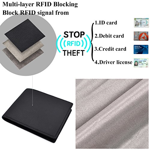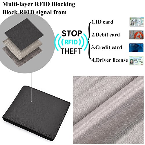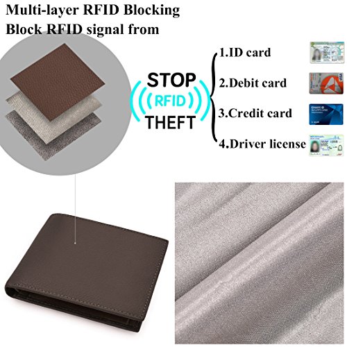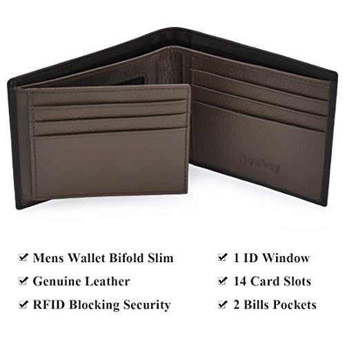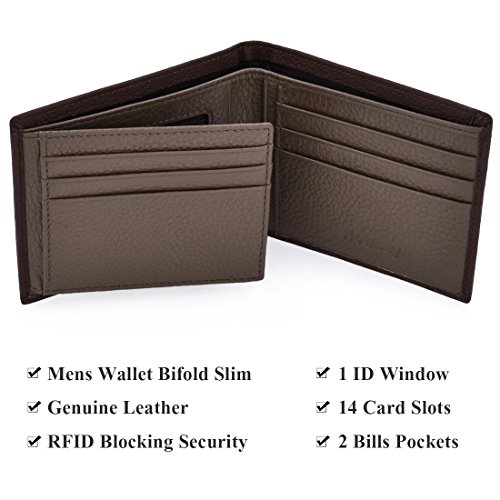 STRUCTURE * Genuine Leather RFID Blocking Slim Wallets for Men Bifold * 14 card slots,ample room for 14 cards and other items. * 1 clear ID window which is ideal for storing and showing your identification card/drivers license to others. * Excellent RFID anti-theft feature,RFID blocking front pocket. * Two bill bags.