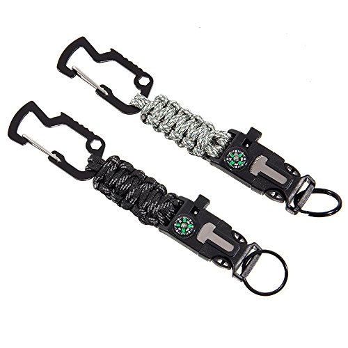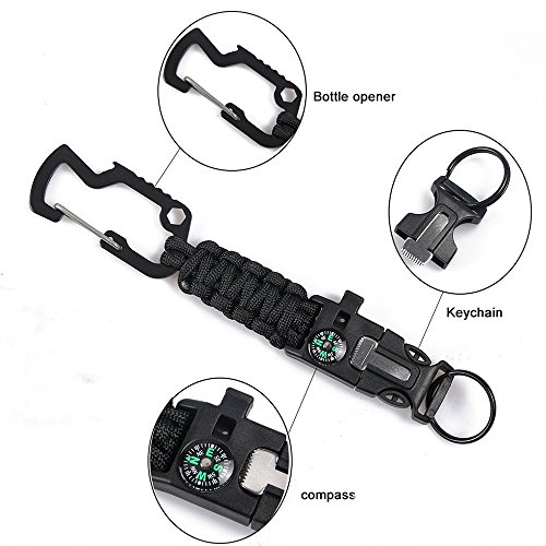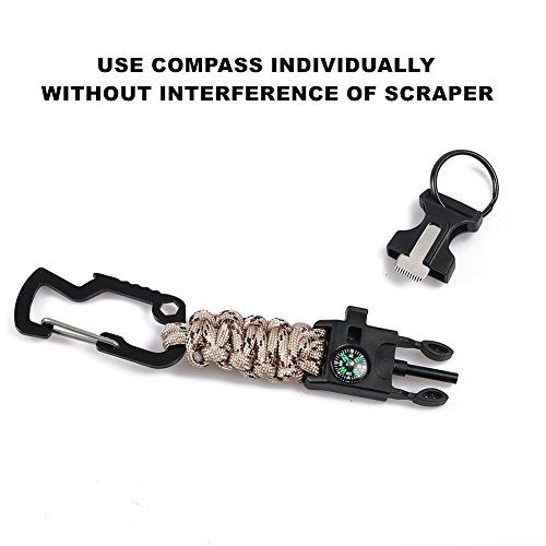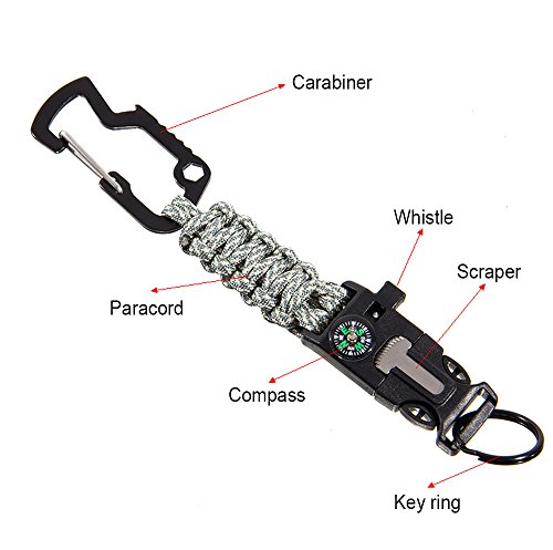 - 8-IN-1 EDC Keychain: Carabiner, Compass, Bottle opener, Whistle, Fire stater, Key ring, Emergency paracord, Scrapper (Emergency Knife).