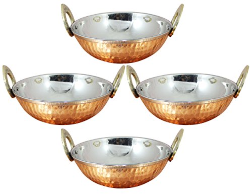 This is a set of 4 vegetable serving pans called Karahi in india. They are made of high quality stainless steel with an outer layer of copper, making it resistant to heat and corrosion. The copper layer will keep the curry warm on the dining table. These karahis are traditional tableware to serve Indian dishes, both dry kind like the biryanis fried vegetables or meat, as well as curry items like chicken curry or daal. Be aware that these karahis have two layers of metal, which enable them to preserve heat for longer duration. These karahis should never be used as a cookware. Therefore these karahis should be used only as centerpiece serve ware tableware. Double layer of metals with air cushion minimizes heat radiation. Bring the curry restaurant experience into your home with these hammered karahi (serving pans) with handles. With these copper serving utensils, you will be able to give your guests the most authentic feel of traditional Indian dining. The hammering by hand on the copper metal makes it look beautiful. Use this karahi pan along with other copper tableware items to get an authentic Indian dining experience.Care Tips:- Clean your copperware by hand and avoid dishwasher as the detergent can cause oxidation leading to permanent damage. Use a solution of equal quantities vinegar or lemon juice and salt diluted with some water at such times but don't use it regularly. Also avoid scratchy cleaners like steel wool. A simple, soft cleaning liquid on soap base, hot water and a soft washing cloth is best for daily use.