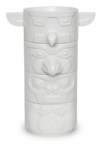 Representing a modern interpretation of an of early Native American tradition, this attractive series of stacking bowls observes the First Nation's custom of pole carving. A totem is an object, usually an animal, which serves as an emblem for a family or clan and embodies a sacred relationship between nature and humanity. Totem poles are monumental sculptures of the Native tribes of the Pacific Northwest. This set includes four white ceramic bowls, each with a different design by Rob Southcott.Feature