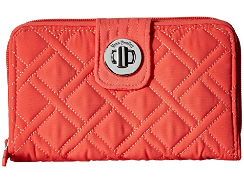 PERFECTLY PLACED POCKETS: Our Vera Vera RFID Turnlock Wallet measures 7.75 x 4.75 inches and features 1 zip exterior pocket with zip main pocket containing 12 card slips, bill pocket, slip pocket for your checkbook, and ID window