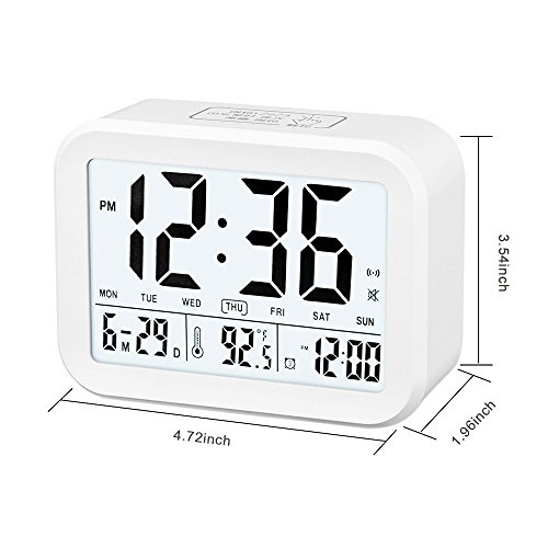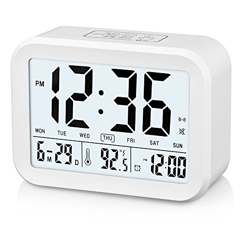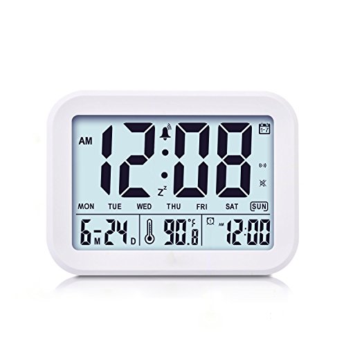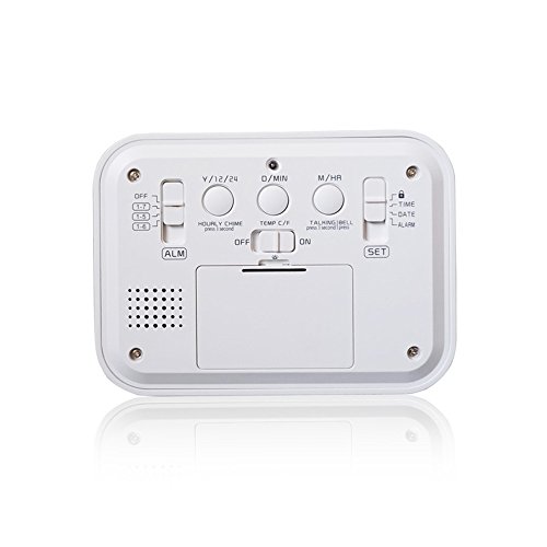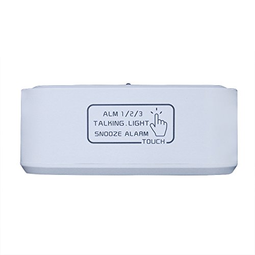 FAMICOZY Talking Alarm Clock with Smart Light and Snooze,7 Sounds to Choose,3 Alarms for 5/6/7 Days,Week Date Temperature,12/24hr Battery Operated Clock,White