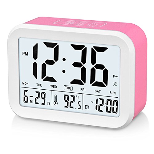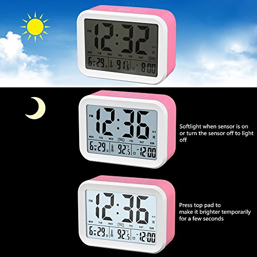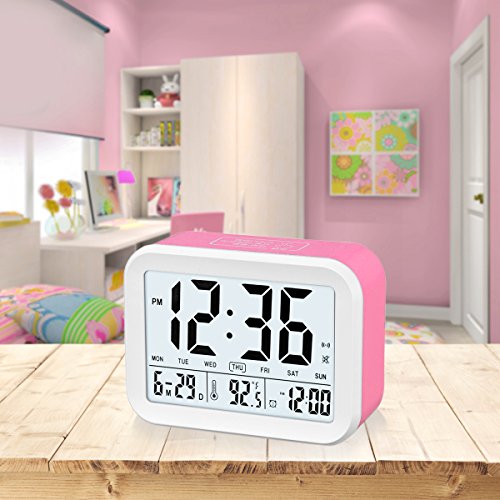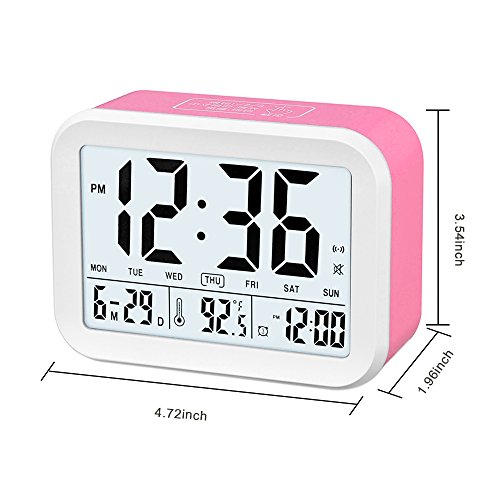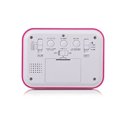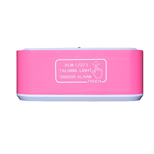 FAMICOZY Talking Alarm Clock with Smart Light and Snooze,7 Sounds to Choose,3 Alarms for 5/6/7 Days,Week Date Temperature,12/24hr Battery Operated Clock,Hot Pink