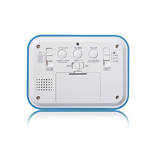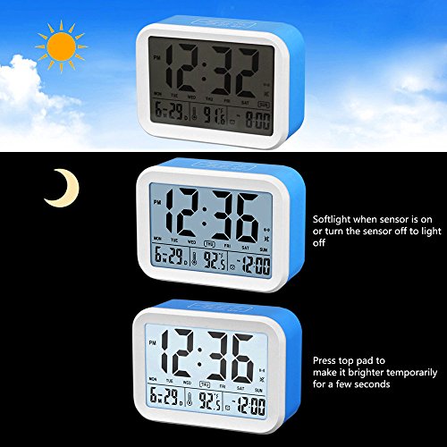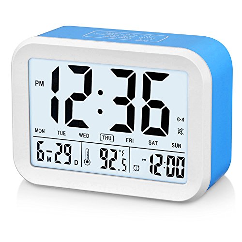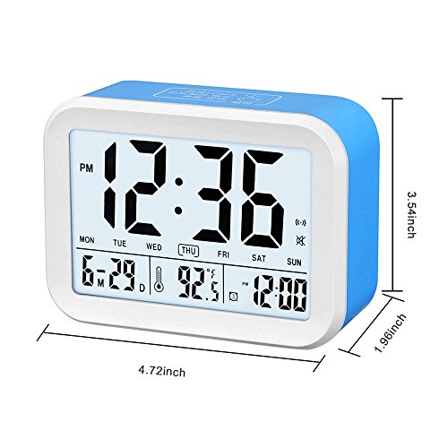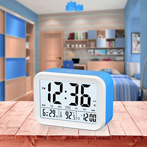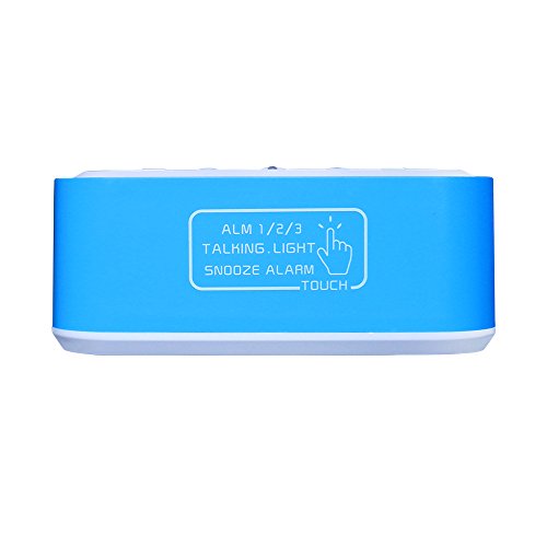 FAMICOZY Talking Alarm Clock with Smart Light and Snooze,7 Sounds to Choose,3 Alarms for 5/6/7 Days,Week Date Temperature,12/24hr Battery Operated Clock,Blue