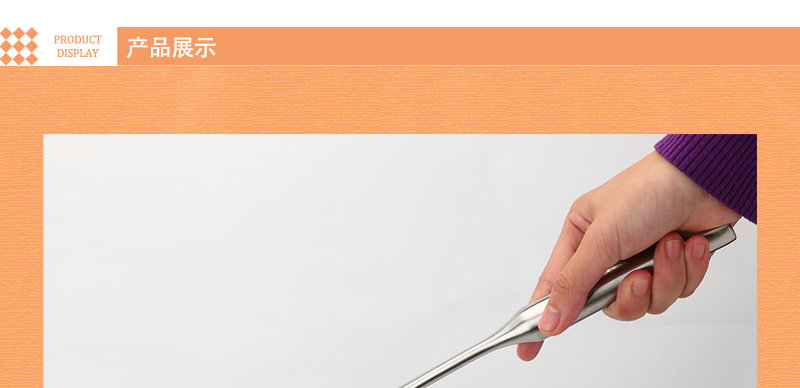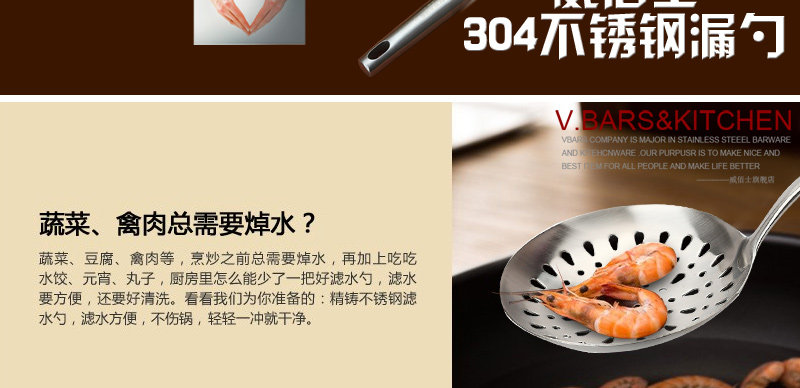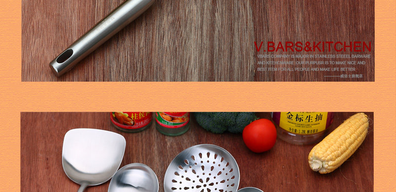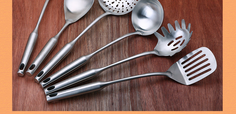勺身采用弧形设计,精工细磨,圆润平滑,不易伤锅,一体无痕设计,强而有力,美观实用,无接痕易清洗不易断柄,流线型防滑设计,中空防烫,实用挂孔设计,可悬挂在厨房任何地方,方便收纳