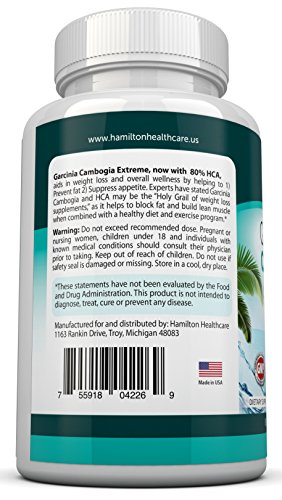 -. Binding : Health and Beauty -. Brand : Hamilton Healthcare -. EAN : 0755918042269 -. Feature : MOST PURE AND POTENT CONCENTRATION AVAILABLE: 100% PURE Garcinia Cambogia Extract with maximum strength 80% HCA studied for its potential to reduce appetite and help prevent weight gain. Combined with a healthy diet and exercise, your goals can be achieved quickly! / ALL NATURAL FORMULA WITHOUT JITTERS: Our non-stimulating formula is a favored alternative to other supplements that can have undesirable effects. Garcinia Cambogia has been linked to mood boosting effects and can help you stay positive and focused during your journey! / SAFE AND EFFECTIVE: Our supplement is made with potassium to increase bioavailability in the body. Free of fillers, binders, and artificial ingredients. NO magnesium stearate, silicon dioxide or calcium, which can block absorption hydroxycitric acid (HCA). / SCIENTIFICALLY FORMULATED FOR MAXIMUM QUALITY: Hamilton Healthcare supplements have passed extensive third-party quality control testing before being bottled and sold. We use only FDA regulated GMP certified manufacturing facilities in the USA. / GREAT VALUE! All of our products are backed by our 60-day, no questions asked money back guarantee and world-class customer service!! -. Label : Hamilton Healthcare -. LegalDisclaimer : These Statements have not been evaluated by the Food and Drug Administration.This Product is not intended to diagnose, treat, cure or prevent any disease. -. Manufacturer : Hamilton Healthcare -. MPN : Garc-1012 -. PackageQuantity : 1 -. PartNumber : Garc-1012 -. ProductGroup : Health and Beauty -. ProductTypeName : HEALTH_PERSONAL_CARE -. Publisher : Hamilton Healthcare -. Studio : Hamilton Healthcare -. Title : 80% HCA Super Strength Garcinia Cambogia Extreme With No Calcium 180 Fast Acting Capsules. All Natural Appetite Suppressant and Weight Loss Supplement By Hamilton Healthcare up to 4500mg Per Day for Maximum Results -. UPC : 755918042269