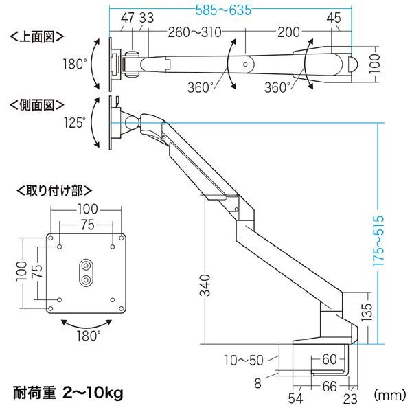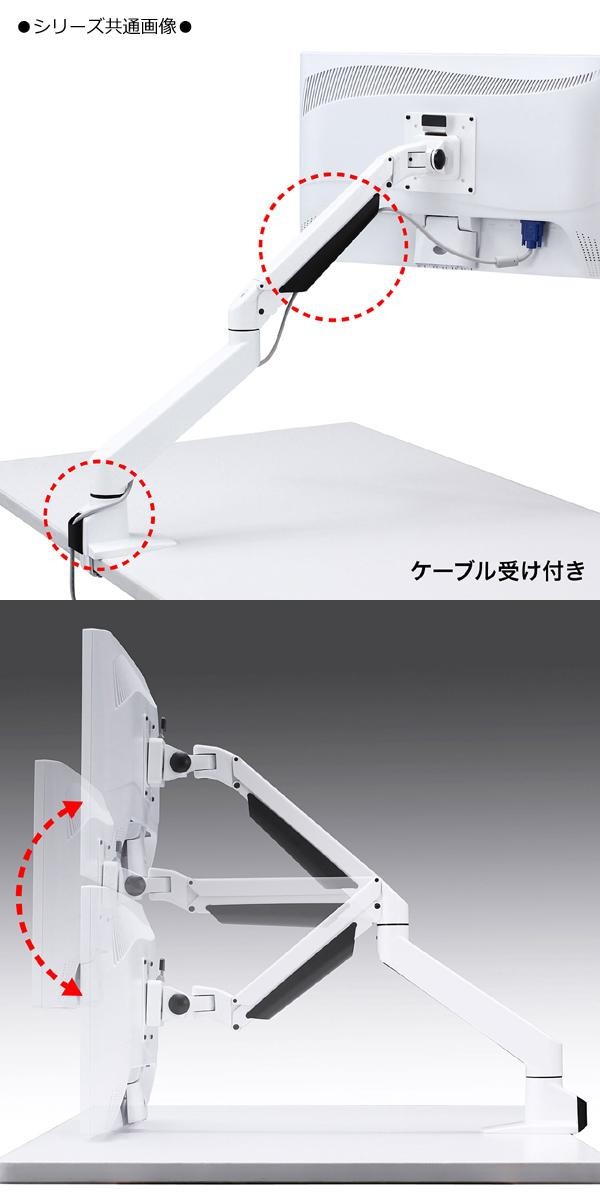| 水平アームとガスシリンダーを内蔵した垂直アームを組み合わせたモニターアームです。使用する目線の高さに合わせて、位置を変更することができます。 |