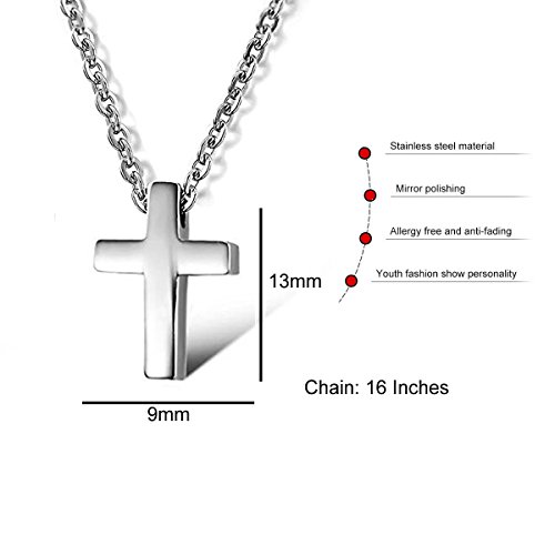-. Feature : CROSS This is a very small Dainty Cross, Mini Size and simple Design works best for Children, Boys and Girls, the perfect gift for your son or Daughter, Kids or Friends this Small Cross is your best Choice / HIGH QUALITY Stainless Steel, resists corrosion and wear, is hypo-allergenic, and nickel, lead & cadmium-free. Beautiful Silver Plated will never wear off, tarnish, or turn colors. STRONG STEEL keeps your charms safe. Does not require regular polishing like 925 sterling silver. / MEASUREMENT: Pendant 13mm x 9mm, Link Chain Length 16 Inches / INSPIRING: Remind yourself or a loved one what it takes to live a fulfilling life with this beautiful Cross necklace! It's a special gift that person will keep forever. Excellent design to wear around your loving person's neck. She will love it! The stylish design complements any look and makes a great fashion accessory! / Stainless Steel Cross Religious Pendant Necklace,Unisex, Silver-Tone 16" Chain or Children Boy Girl Teens