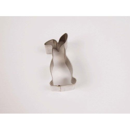 - Stainless steel rabbit with hanging ear shaped cookie cutter, measuring 2 3/4 inches