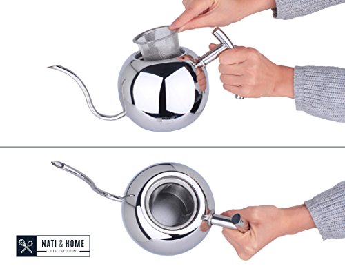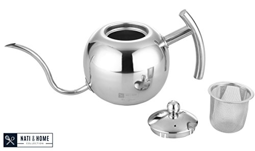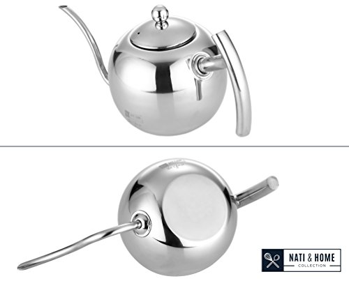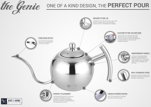 - Feature : FUNCTION MEETS STYLE: Hands down THE MOST aesthetically beautiful kettle on the market; UNIQUE sphere design, impress your guests by bringing class and décor to any environment. Makes the perfect gift for men and women on almost ANY occasion including Christmas, Holiday, Xmas, Graduation, Anniversary, Couples, Mother Day Gifts, Wedding, Birthdays for him or her, Mom, Dad, Family, College, Bridal, Housewarming, and Engagement. / CONTROL POUR DESIGN: The narrow curved gooseneck spout offers precise control of water flow during the pour over method for your drip brew - allowing the most flavor and infusion to slowly prepare your coffee and tea. / 100% POLISHED STAINLESS STEEL: NO plastic or teflon attachments or handles. / VERSATILE: 1.1L capacity - approx. 4 Cups. Detachable Tea Infuser INCLUDED. Easy and safe to use on gas, electric stove tops. / 100% SATISFACTION GUARANTEED: We are family owned and above ALL else we value our customers. If for any reason you are not absolutely satisfied with your Nati & Home Genie Kettle simply contact us and we will refund or replace it for you.