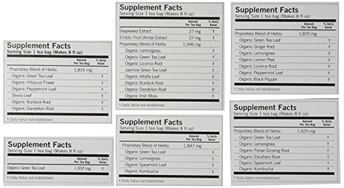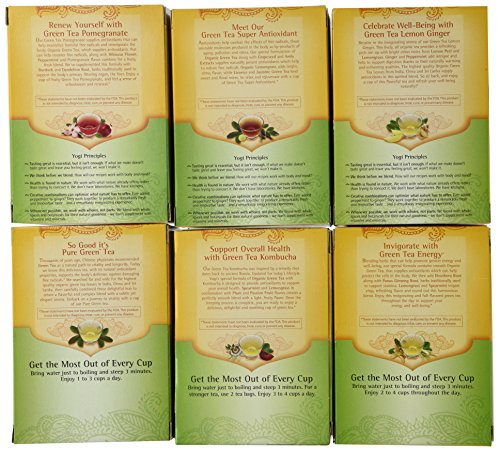 Yogi Tea Green Tea Variety Pack. Features 6 Varieties of Yogi Tea (Each Box Contains 16 Tea Bags). Flavors Include: Green Tea Energy, Green Tea Kombucha, Green Tea Lemon Ginger, Green Tea Pomegranate, Green Tea Pure Green, and Green Tea Super Antioxidant. 100% all natural herbal supplement made with non-GMO ingredients.Feature