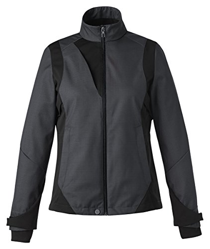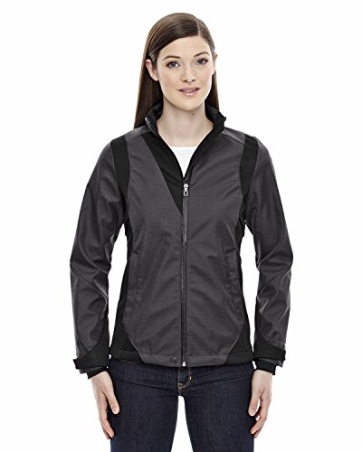 Binding : Apparel Product Description North End Sport Blue COMMUTE Ladies' 3-Layer Light Bonded Two-Tone Soft Shell Jacket, 100% polyester w/Heat Reflect interlock, 7.2oz./yd2/245gsm, 8,000 mm waterproofness/800 g breathability, soft shell bonded with Heat Reflect fabric, inside stylized storm placket; uniquely shaped chin guard, brush tricot-lined stylized shaped collar, underarm and back vent system for added breathability, audio port access through inside left pocket, adjustable shockcord at waist and at hem. 0