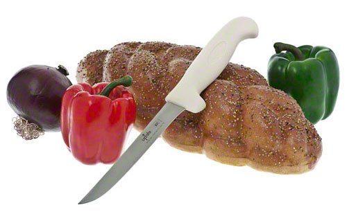This professional grade cutlery straight stiff blade boning knife is skillfully hand-honed to deliver the sharpest edge and maximum cutting performance. This knife is carefully manufactured of German high-carbon stainless steel with molybdenum vanadium. It is NSF listed. Available in 5-1/2-inch white handle. Blade measures 6-inch length by 3/4-inch width tapered. Measures 11-1/4-Inch overall length.