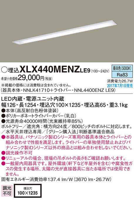 ●寸法(mm):幅126・長1254・埋込穴100×1235・埋込高65
