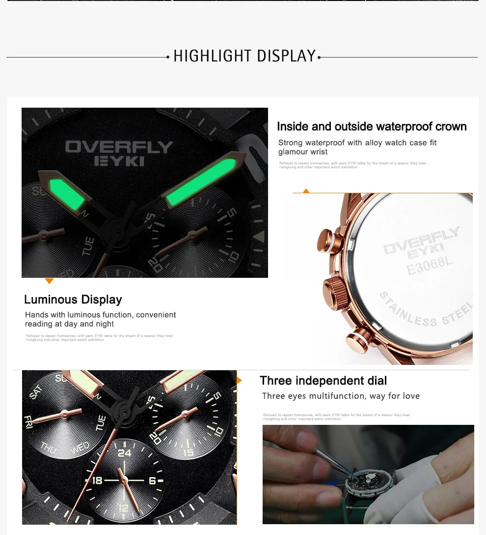 Feature:Complete Calendar,Water Resistant,Auto Date ,Week,Luminous Hands
