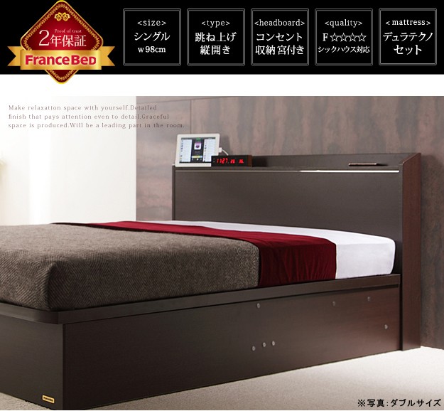 フラットなヘッドボードで壁にぴったり寄せて使えます。跳ね上げ式収納で大容量。長物も収納できます。フラットなデザインなので2台並べて使用できます。