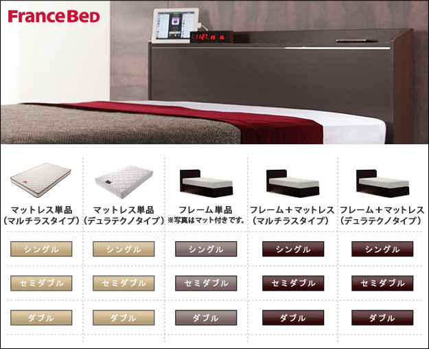 材質:[ベッド]本体-プリント紙化粧合板、コンセント-1口(1500W)、[マットレス]側地-ポリエステル50%・ポリプロピレン50%、中身-ウレタンフォーム・パームパッド・ポリエステル綿・防虫不織布・羊毛、コイル-デュラテクノスプリング・コイル数450、通気孔-アイレット加工