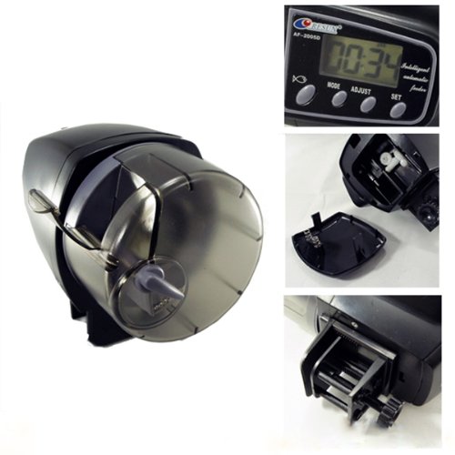 Features:* Mini shape, space-saving for your aquarium.* Patented design for moisture proofing, mixing, and crumbling food.* No jam, no clog and no fuss.* Can fill the container with food without disassembling the automatic feeder.* Programmable food volumes and feeding times.* By adjusting the slider, you may increase or decrease the amount of food dispensed per rotation.* Works with dry loose flakes or pellets.* Up to four times setting in one day.* The logo "Lo" displayed on the LCD indicates the power is low.* Powered by 2*AA batteries. (batteries Not included)* Has a built in digital clock for accuracy.* Can work both automatically and manually.* A clear easy-to-read LCD screen which shows all info at a glance.* The feeder can be mounted in two ways (free-standing or rim-mounted) according to the shape of your aquarium.* Safe and convenient.* Simple operation and installation.Specifications:* Color: Black* Condition: 100% brand new* Housing: Plastics* Can set up to 4 feeding times* Type of battery: 2*AAA batteries (included)* The logo "Lo" displayed on the LCD indicates the power is low.* Unit dimensions (approx.): 4.3*4*2.5inch (11*10*7cm)J* LCD screen dimensions (approx.): 1.1*0.5inch (2.6*1.3cm)Notice:* Don' t twist the feeding box by hand.* Do not use rechargeable batteries.* The logo "Lo"displayed on the LCD indicates the power is low. If batteries are not replaced after 3 days, all the programme will be stopped , and the feeder box may be stopped in the inappropriate place.* If LCD is displayed abnormally after completing batteries setting, please take out batteries and set them after one minute.(it is not malfunction of the feeder)Package dimensions: 120*110*77mmPackage weight: 242g Packing includes 1×Fish Food Feeder 1×manualFeature