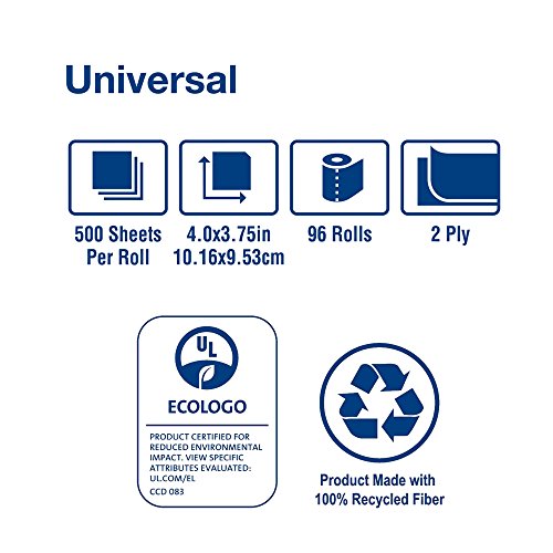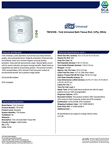 Studio : Tork Publisher : Tork Binding : Misc. Product Description Tork Universal 2-Ply Bath Tissue is an absorbent economical bath tissue that delivers value and performance while embossed to enhance bulk and softness. Special tightly wound rolls and easy start tail seals to prevent waste and aid in source reduction. Each roll is elegantly wrapped ensuring sanitary protection while delivering quality, value, and performance. Tork toilet paper has rapid breakup, ideal for all plumbing systems. Tissue is made from 100% recycled fiber, with a minimum of 20% post-consumer fibers, providing environmental benefits and is a positive image builder. 2 ply. Number of sheets: 500. Sheet length: 3.75-inches. Core inside diameter: 1.65-inches. Roll measures 4.35-inches diameter by 156.25-feet length by 4-inches width. White color, perforated. ECOLOGO Certified and EPA Compliant. Can also be used with the Tork 59TR Bath Tissue Dispenser. 0