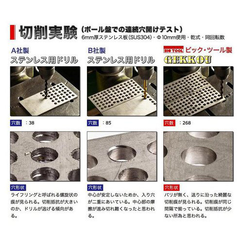 ●SUS 304、6mm厚、ドリル径10mm、乾式にて約20秒で貫通。