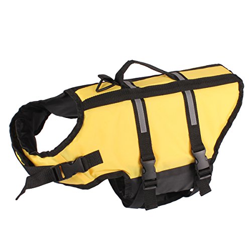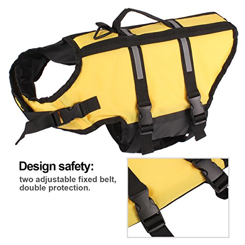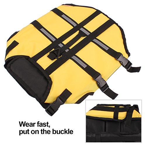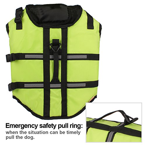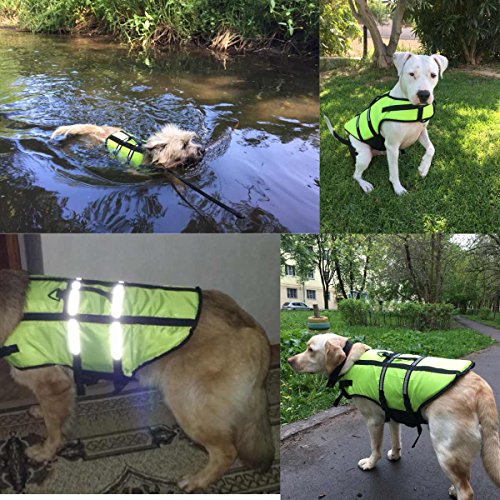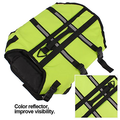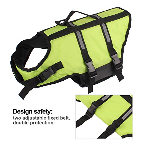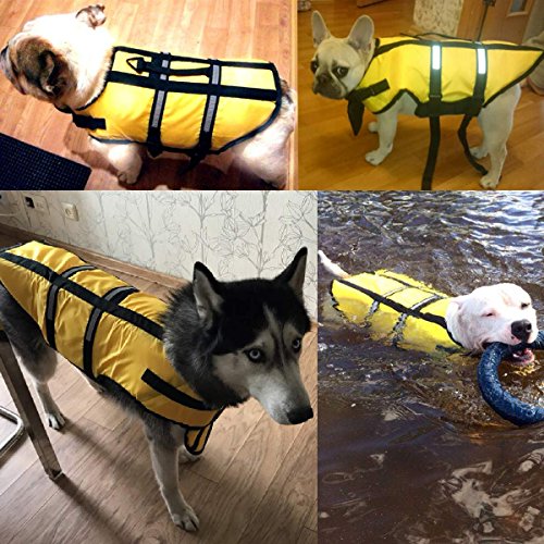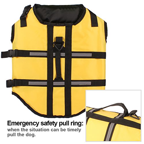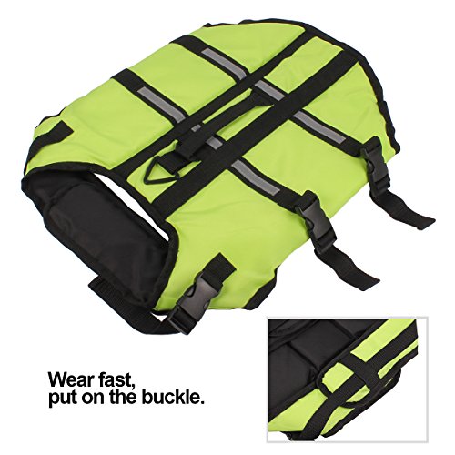 -. Feature : 1: Material: Oxford cloth + foam; this dog lifejacket is very thin for dog on summer, after the dog wearing, it will be very light and learn swimming more flexible / 2: bright colors, safe bright color, easy to identify at night and during the day to ensure the safety of dogs; / 3: emergency safety pull ring can occur in time to pull the dog / 4: two adjustable belt, double protection; ultra-wide abdominal support, increase comfort, enhance safety, not easy to hurt / 5: At the first time, the dog may be afraid of the water, will not get used to water,; so put on life jackets for the dog, then can ensure the safety of the dog. Summer is coming, and quickly take the dog to learn to swim it!