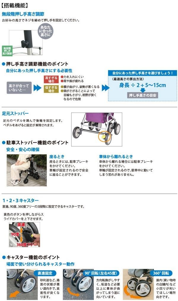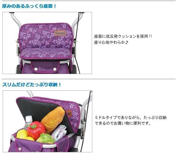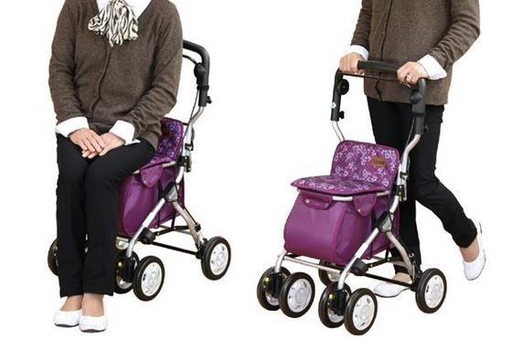 コンパクトタイプとスタンダードタイプの間に位置する、使い勝手の良いシルバーカーです。軽量でありながら安定感があり、適度な収納量なので、毎日のお買いものにも最適です。歩行で疲れた時は座って休むこともできます。 |