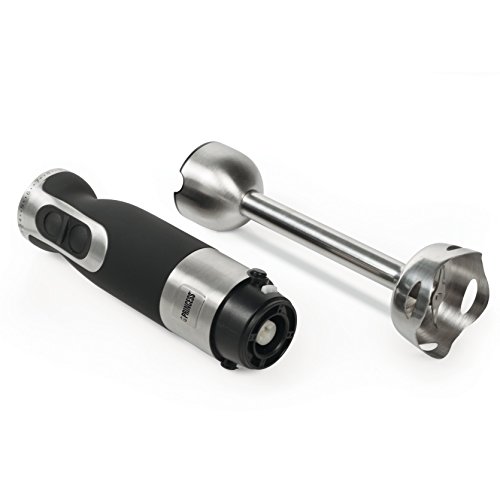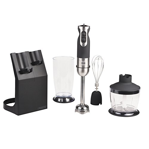 If you're looking for a practical and functional product, you can't miss the Princess 221203 hand blender-chopper! You will be able to blend, whip and chop with a single product. It also includes a handy stand (approx. 17 x 27 x 17 cm) for proper storage. Approx. dimensions of the blender with the handle: 5 x 39 x 5 cm. Comes with stainless steel blades. Characteristics: Power: 600 W Frequency: 50-60 Hz Voltage: 220-240 V Whisk (approx. 24 x 5.5 x 5.5 cm) Chopping container with removable blades made of stainless steel (approx. 13.5 cm in diameter x 18 cm in length) Capacity of the chopping container: 0.5 L Measuring jug of 0.8 L (approx. 10 cm in diameter x 21 cm in length) Made of stainless steel and nonslip material 2 speeds and 9 intensity levelsFeature