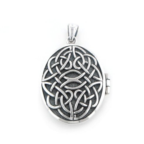 This locket is large and solid with raised Celtic knotwork patterns over an oxidized (darkened) background. The back has a cut-out pattern of geometric shapes to allow light and air though. The locket is oval shaped and opens to reveal a space for a aromatic scents, secret treasures, written prayers, or even a photograph. Crafted of nickel-free sterling silver.Feature
