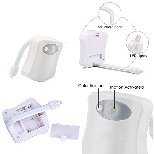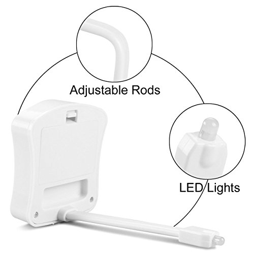 - ✔[ FITS ANY TOILET ] -- Flexible arm with 180掳bending angle,fix any shape of toilet bowl and will stay in place.Extra two pieces of stickers can help to fix the light well but are not necessary. No tools are required.