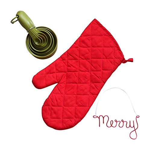 Kitchen Gift Set Red & Green 3 Item Bundle - Red Oven Mitt Green Measuring Cups and Red Wire Handmade "Merry" Holiday Ornament Gift Set