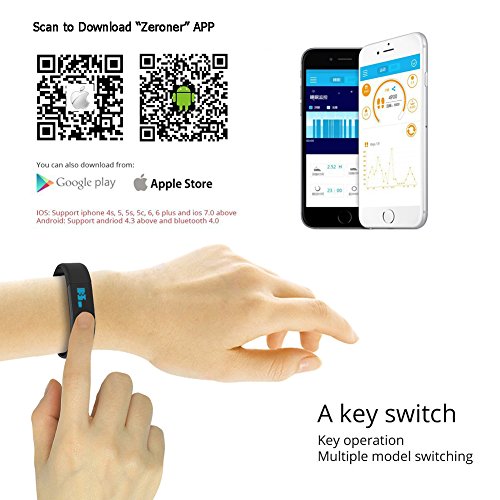 -. Feature : Support bluetooth 4.0, please download the " Zeroner" APP from Google Play Store and Apple Store. / Activity Monitor: anytime record the number of steps you walk, move distance and calorie consumption, so you real-time monitoring their movement index, based on your height, weight and other parameters accurately calculate calories burned / Sleep Quality Monitoring: According to your sleep quality, calculate the depth and shallow sleep time, so you have targeted to improve their living habits, 8 groups silent alarm, in the case without disturbing the family, time to wake you / Support USB & PC side data synchronization: automatic standard USB, can be directly charged with computers, mobile power, easy to quickly add capacity, and can synchronize data and PC, support Windoos XP, Vista, Win7, Win8 system (part of the sub-official version of the Windows system there will be compatibility issues) / Adapt silicone strap, activities snap strap design: the size can be adjusted according to the size of the wrist, more comfortable to wear