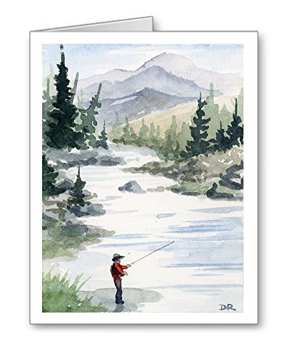 -. Feature : "Mountain Stream" fly fishing artwork by watercolor artist DJ Rogers. / Note card size is 4.25 x 5.5 inches / Matching white envelopes included. / Note cards are blank inside for your personal message. / Suitable for framing.