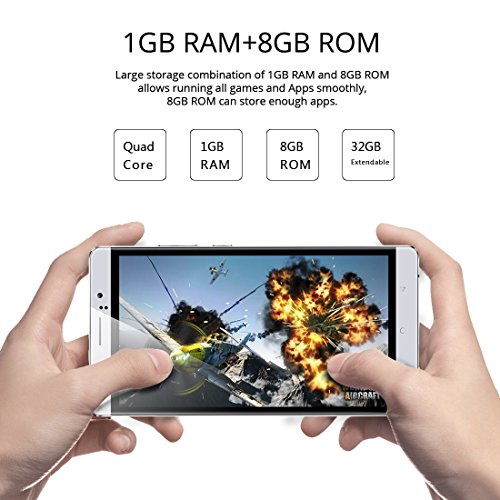 -. Feature : Fast 1.3 GHz quad-core MediaTek 6580 ARM Cortex processor with 8 GB Internal memory and 1 GB RAM / Enjoy Google Android 5.1 Lollipop, including Google Play Store, Google, Google Maps, Gmail, WhatsApp, You Tube and more / Dual SIM and MicroSD support for up to 32 GB of expandable storage / Stunning 6" HD display plus an 5 MP main camera and 2 MP selfie camera, both cameras are with LED flash and auto focus / 3G(WCDMA 850/2100MHz) plus GSM(850/900/1800/1900MHz) unlocked for your favorite compatible carrier or for international travel; For example, works on all Nationwide GSM Networks including AT&T, T-Mobile, Cricket, MetroPCS, Straight Talk USA, Pure Talk USA, O2 (UK), Giffgaff and others; works with 3G for AT&T, Cricket Wireless, H20 and TracFone; Not works with 4G